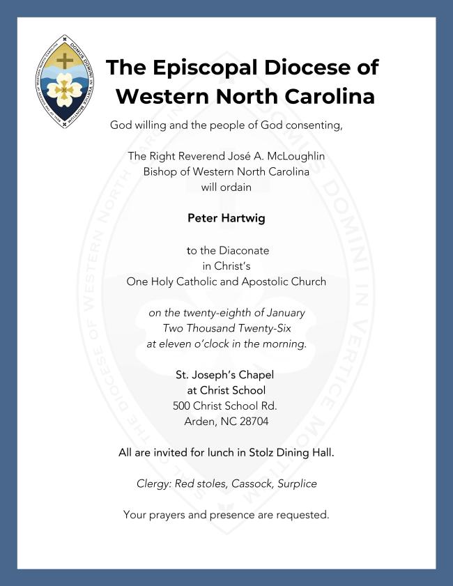 Lastly, I want to make sure that all of you reading this know that you are warmly invited on January 28th to the service in which I will be ordained to the Sacred Order of Deacons in the Episcopal Church.