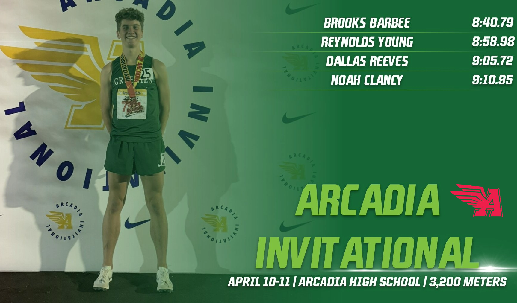 Three others Greenies made the trip to California and ran splendidly as well – Reynolds Young ’27 (8:58.98), Dallas Reeves ’27 (9:05.72), and Iona University recruit Noah Clancy '26 (9:10.95). Reynolds is only the fourth Greenie to break 9 minutes in the 3,200.